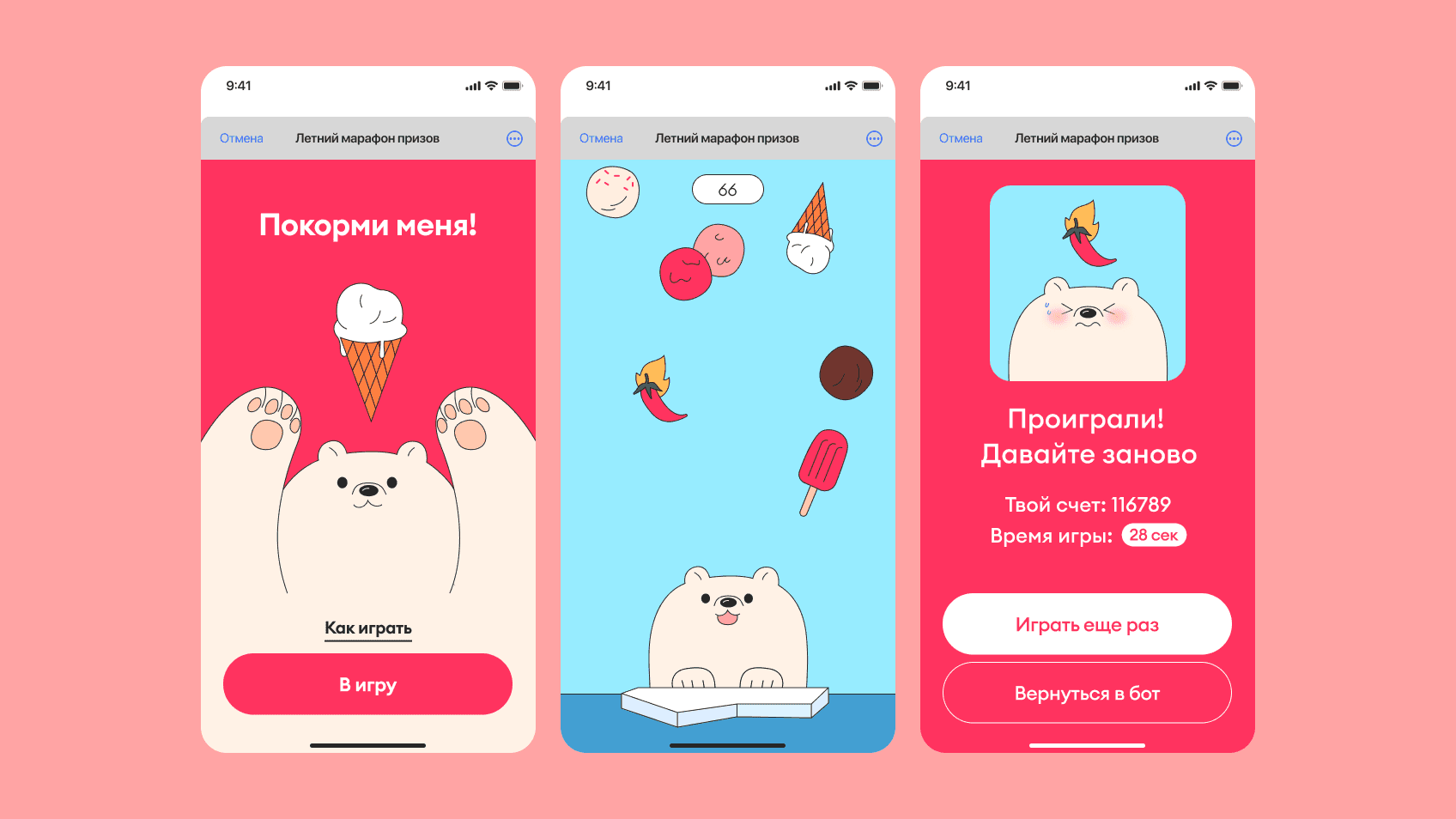 Чтобы «покормить» мишку самым разным мороженым от Самоката, нужно было сыграть в аркадную игру — ловить мороженое и избегать жгучие перчики.