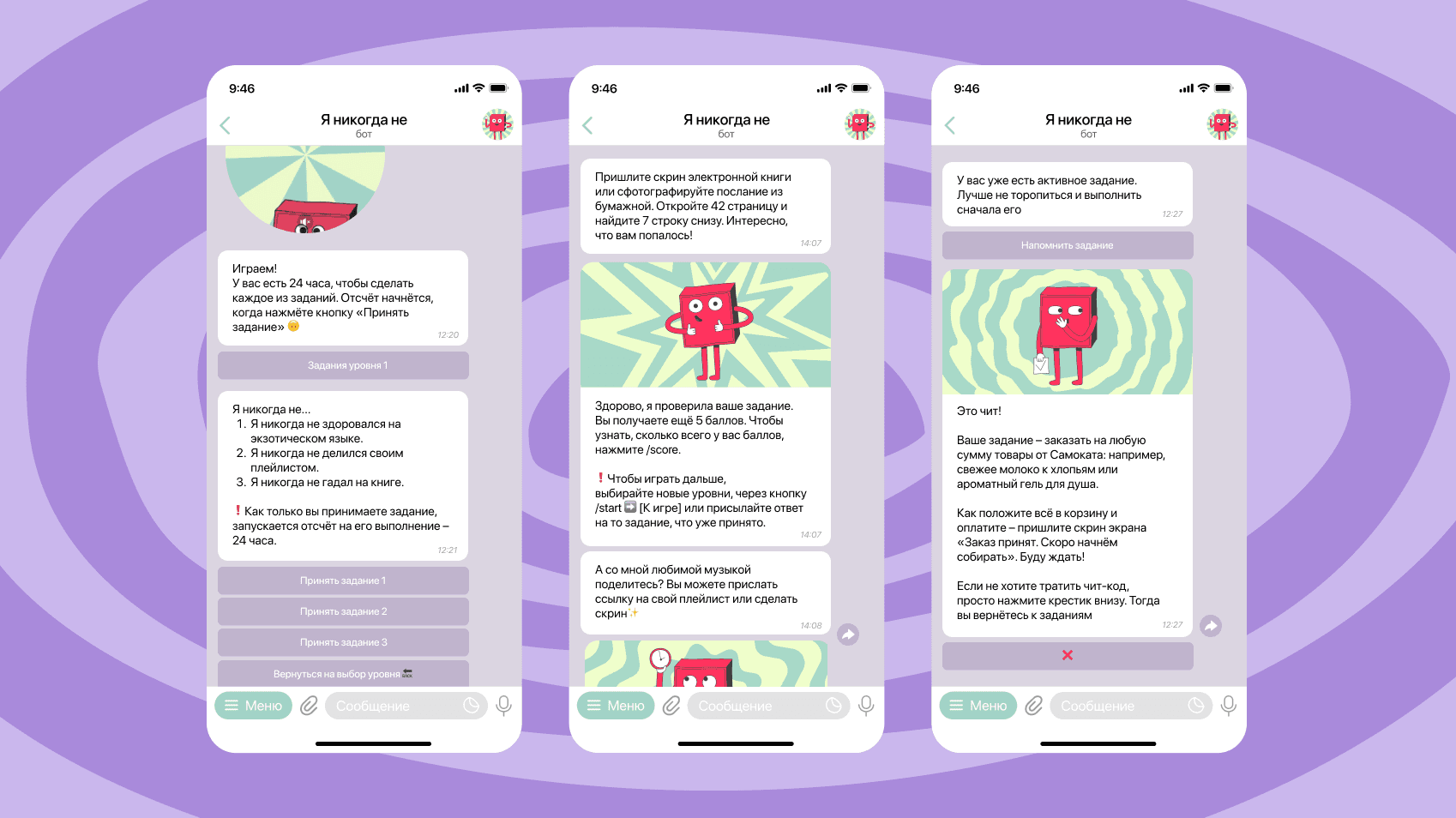 экспериментальный бот в формате челленджа «Я никогда НЕ», задания которого дают возможность получить новые впечатления, попробовать неожиданные хобби и поучаствовать в розыгрыше ценных призов