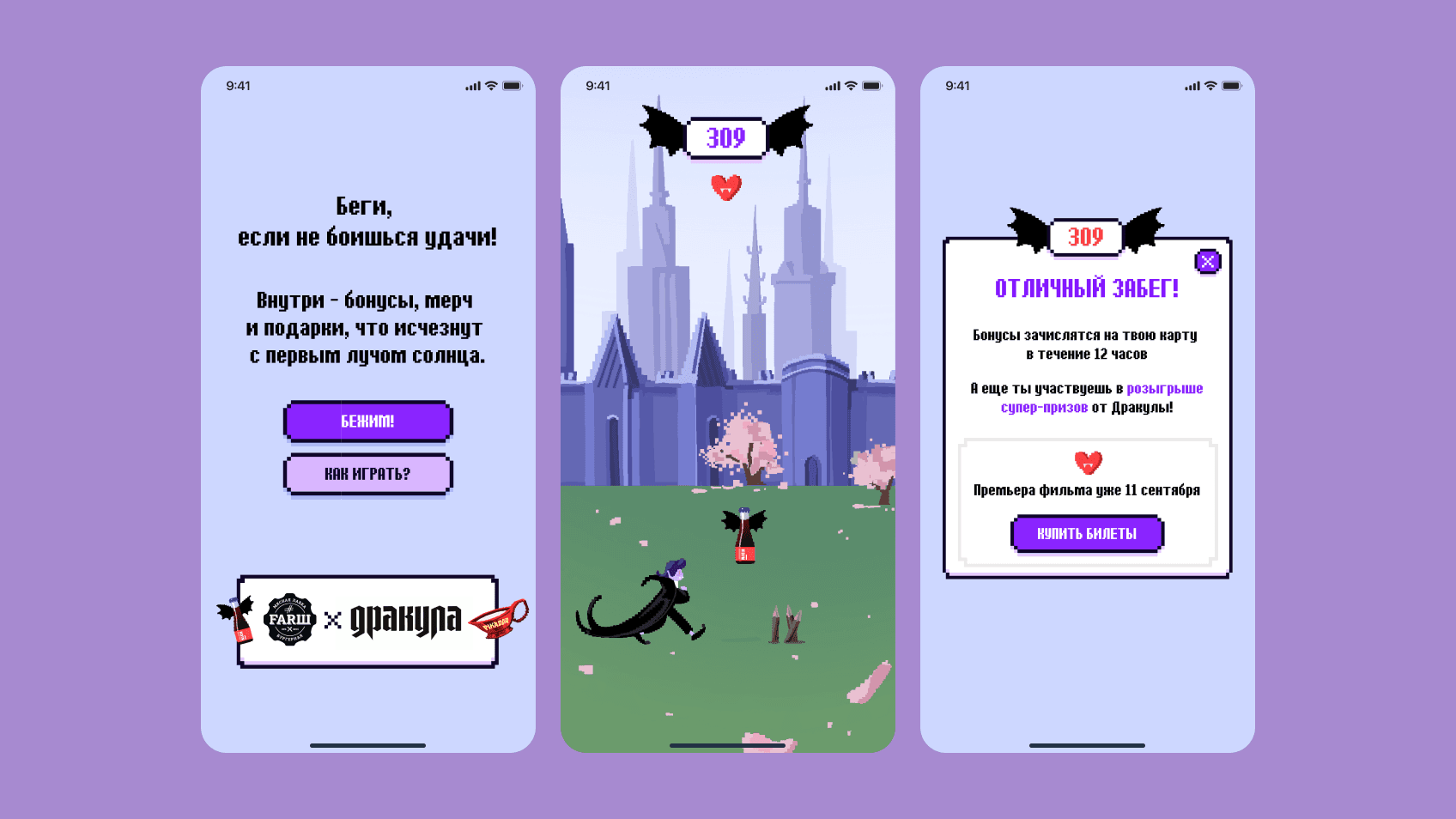 Разработали KV и механику мини-игры в формате «раннера». Герой — сам Дракула — бежит по игровому полю на фоне вампирских декораций, ловя предметы и избегая препятствия.