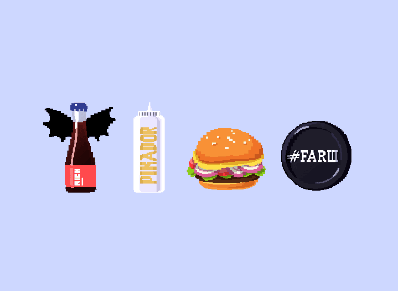 В качестве элементов, приносящих Дракуле баллы, отрисовали сочные бургеры, шайбочки #FARШ и партнерские продукты: бутылки Rich-кола и соуса Picador. Каждые из собранных пользователем предметов имели игровую стоимость и напрямую поощрялись баллами, которые отражались в ситеме лояльности бургерных в конверсии 1 бонус = 1 рубль.