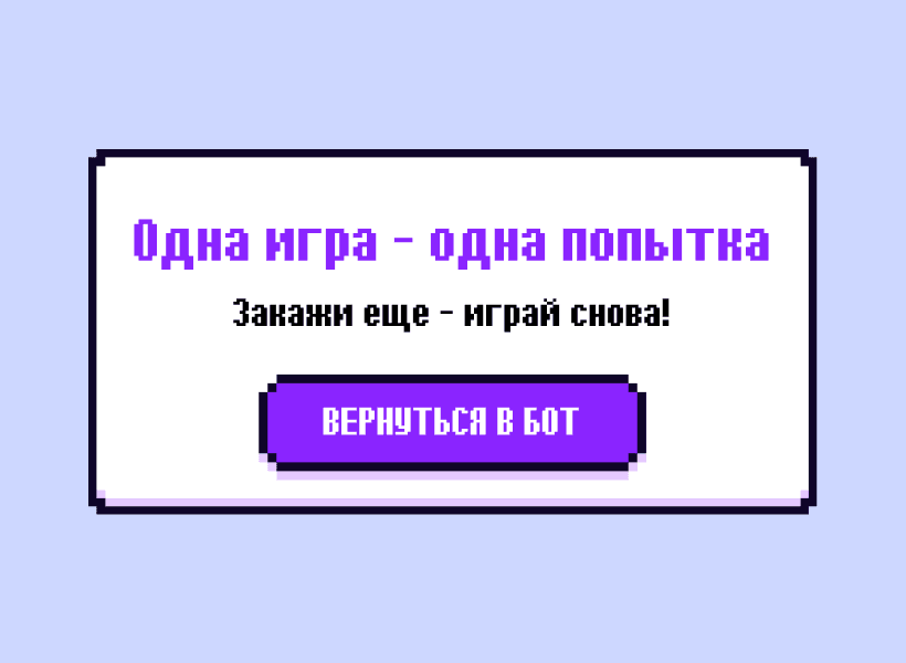Каждый новый заказ в #FARШ открывал пользователю дополнительную попытку игры. Эта механика мотивировала пользователей совершать повторные покупки и увеличивала оффлайн поток гостей бургерных.