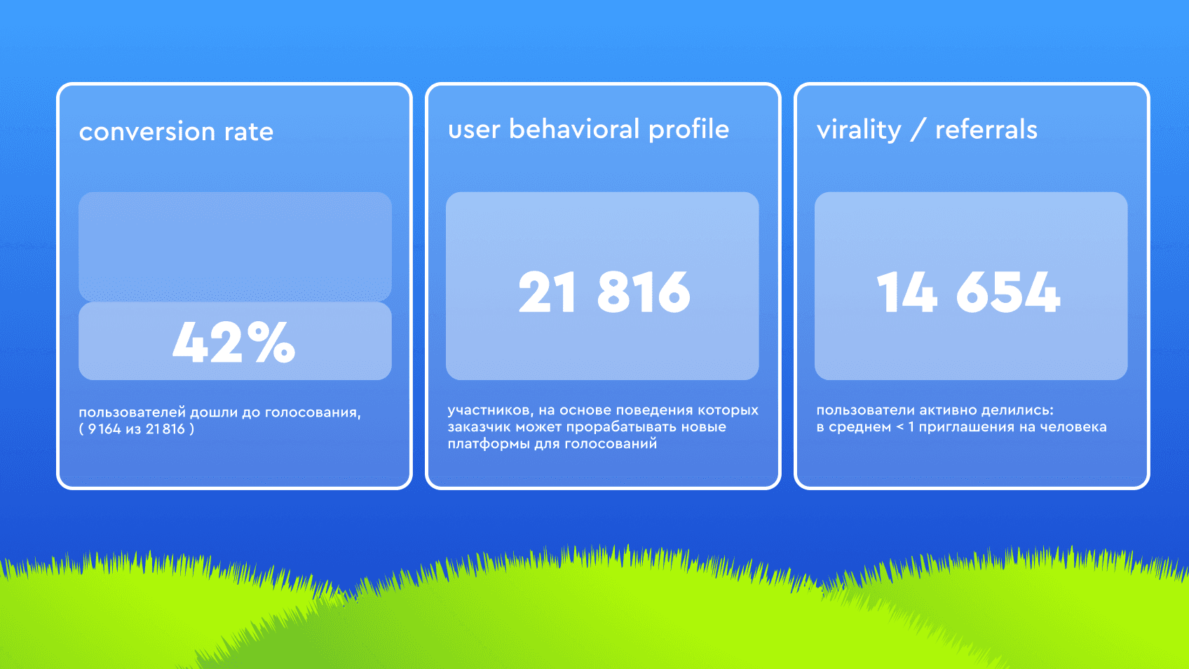 Основная цель проекта — конверсия в целевое действие, а именно голосование на сайте ФКГС. За счет геймификации мы повысили мотивацию участников в действию. Подтверждение голосования интегрировали по API в общую внутриигровую экономику и начисляли баллы в общий игровой баланс участников. Для расширения охватов проекта разработали также реферальную программу и начисляли дополнительные монеты за приглашения друзей.