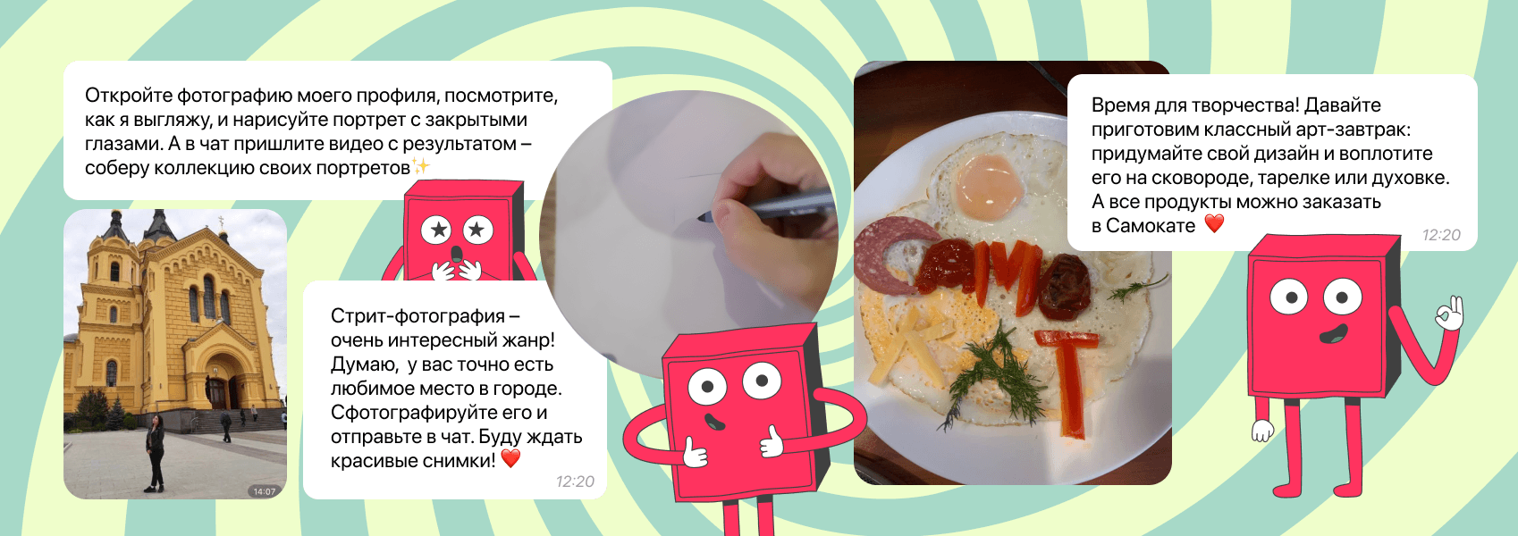Параллельно главной весенней рекламной кампании Самоката «Через вселенные» с игрой про переносящую курьера между мирами ожившую сумку мы создали схожего персонажа-сумочку как ведущего нашего испытания. Приветствующего, дающего задания, напоминающего об истекающем сроке на выполнение выбранного задания.